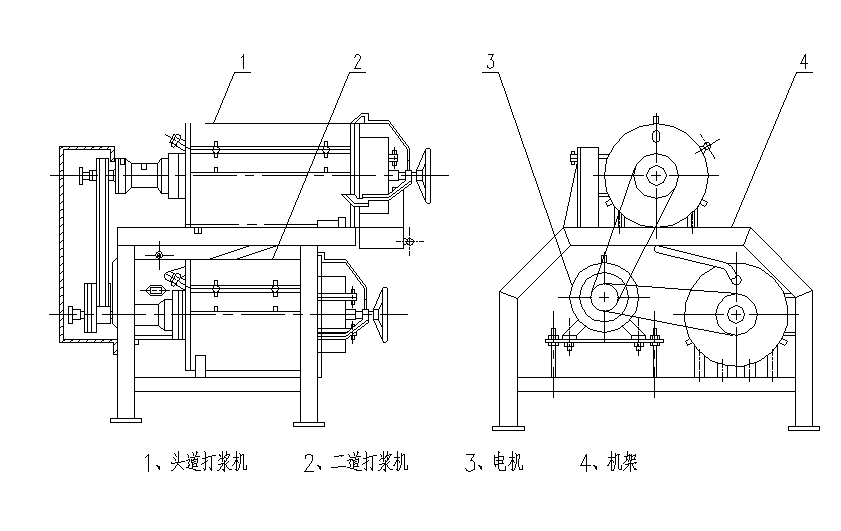 ★ 主要結構:傳動系統、軸承座、套軸、筒后蓋、擋漿盤、筒身、花鍵軸、篩網、刮板(或打漿棒)、筒前蓋、機架等